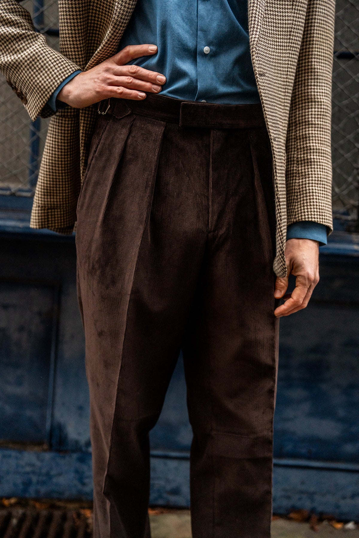 Our Aleks Brown Cordurory Trousers are made in a heavy-weight cloth from Brisbane Moss. You can wear them with knitwear for the weekend, or a corduroy blazer and an oxford shirt for an Ivy look during the week. A strong and solid piece to add to your wardrobe.