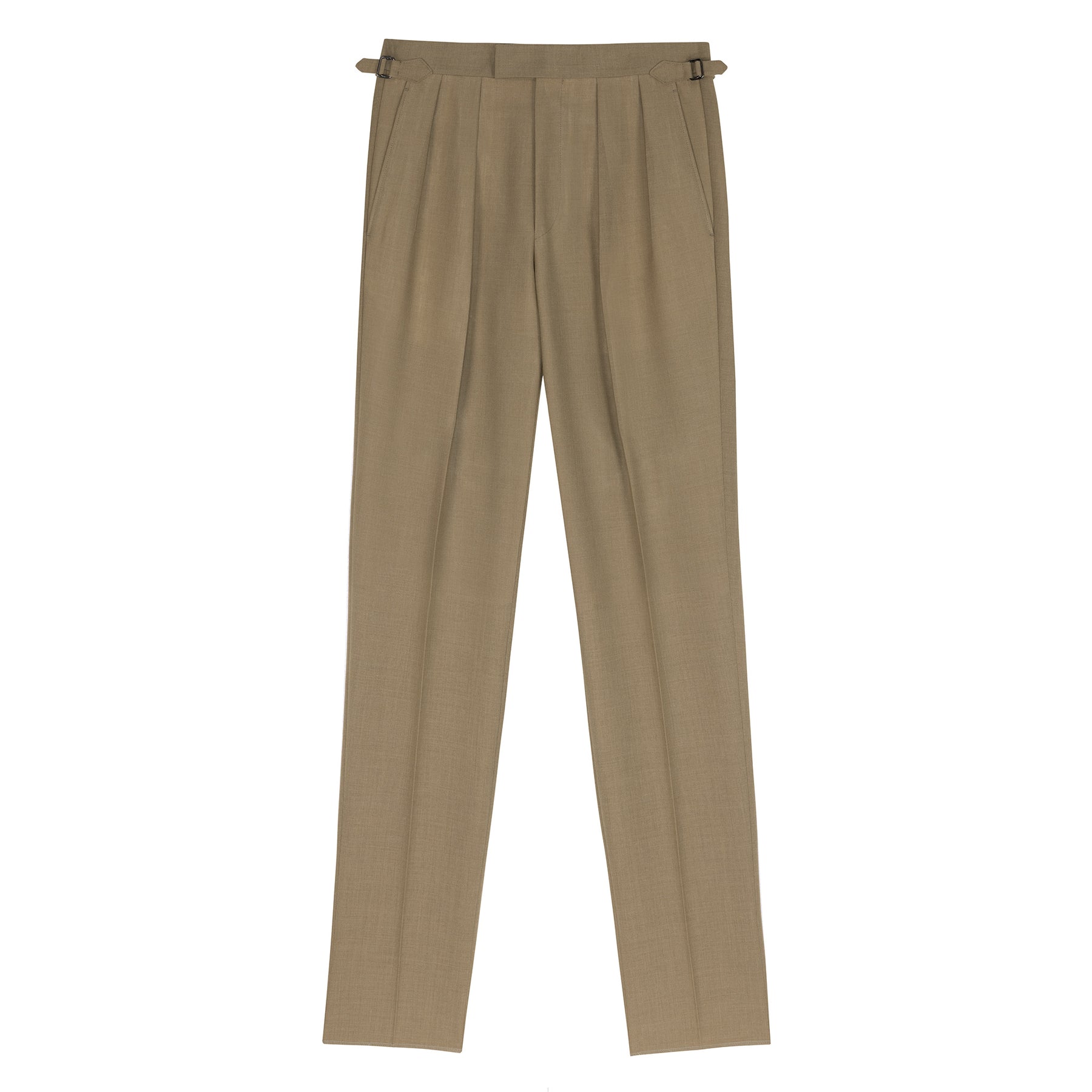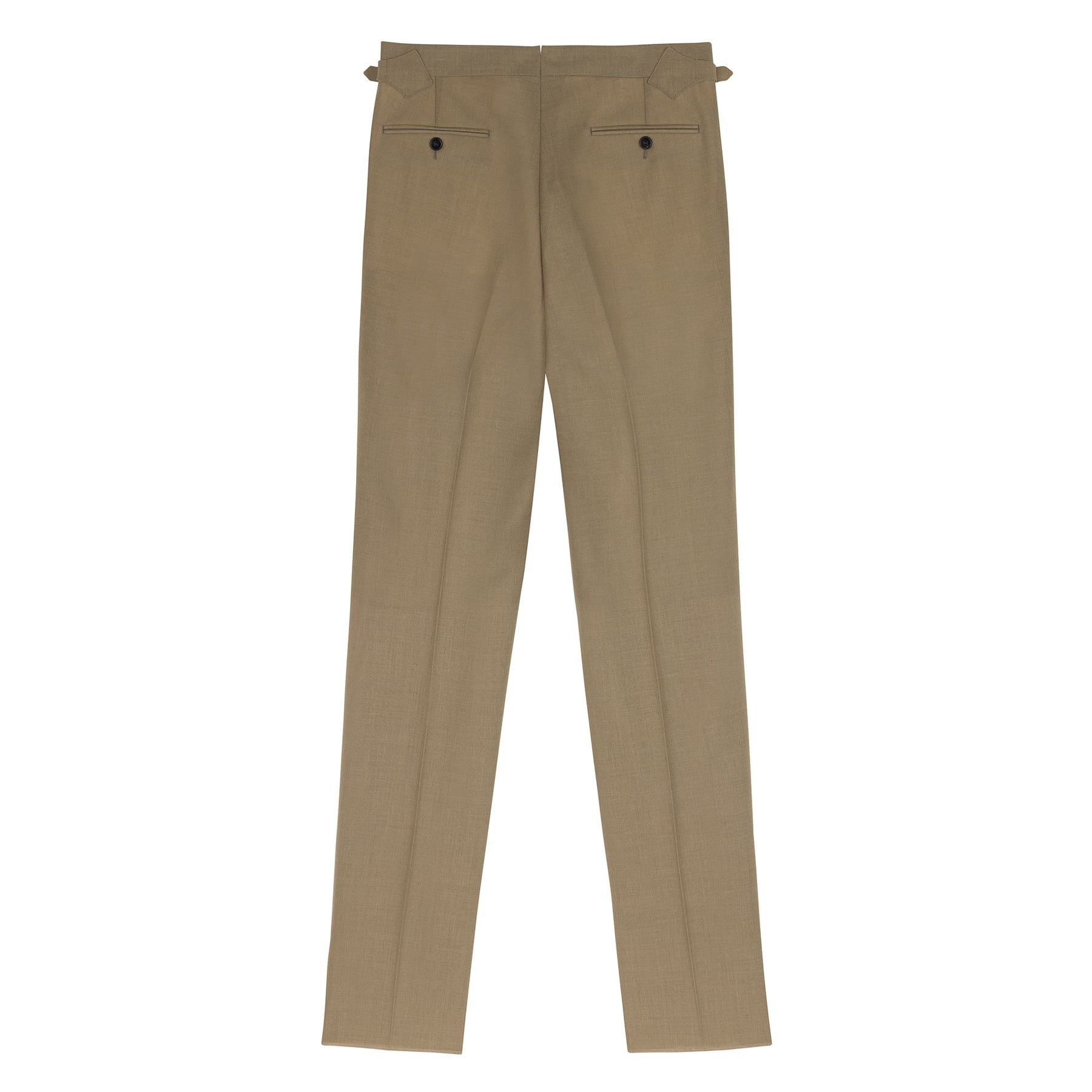 These Grant Sand Fresco Wool Trousers are made from medium-weight wool cloth woven by Hardy Minnis in England, perfect for spring and summer. Fresco fabric is highly breathable, crease-resistant, and has a subtle texture that keeps them from looking like suit trousers. The open weave enhances airflow, making them ideal for warmer weather.