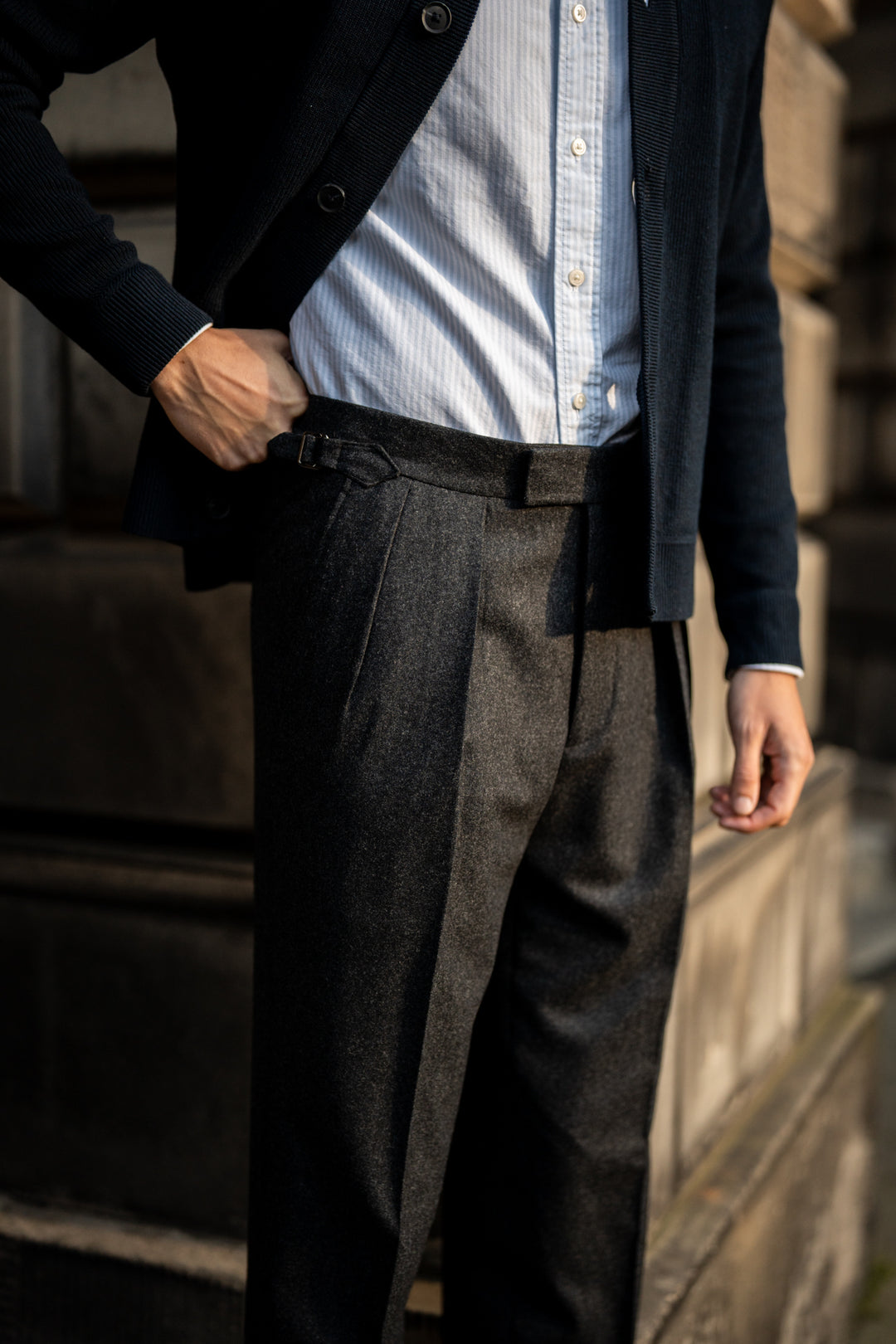 Like all Kit Blake trousers, the trousers do not require a belt due to having side-adjusters. We recommend that these trousers are worn with a turn-up cuff, but it is up to the client’s preference. Note all of the trousers come unfinished to have them altered to your desired length. If you are in-between sizes, we would recommend going up a size and pulling the adjusters in a little closer as needed.